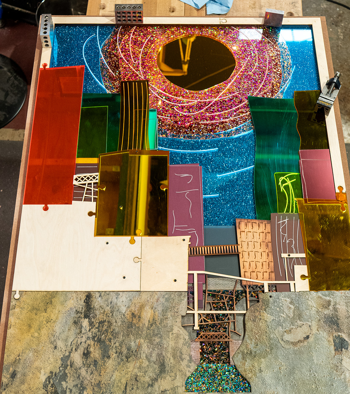 wood, acrylic sheet, stone, mirror