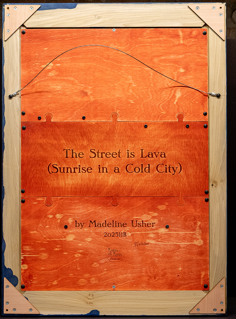 This piece was created using layers of wood, acrylic sheet, and and mirror. The wood layers were worked with watercolors, gypsum paste, and a propane torch. The frame is poplar wood, dyed with aniline dyes and india ink, sealed with tung oil.