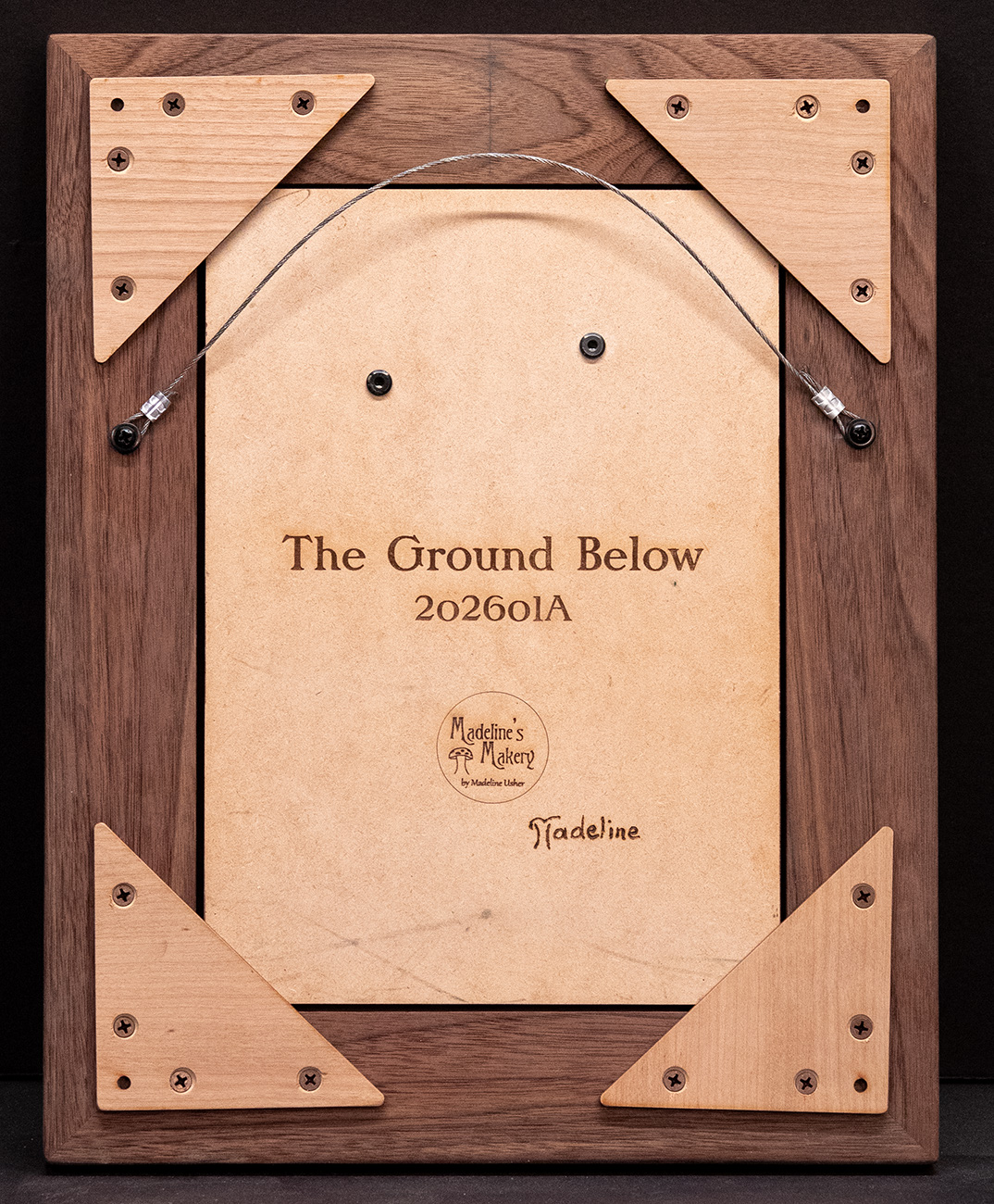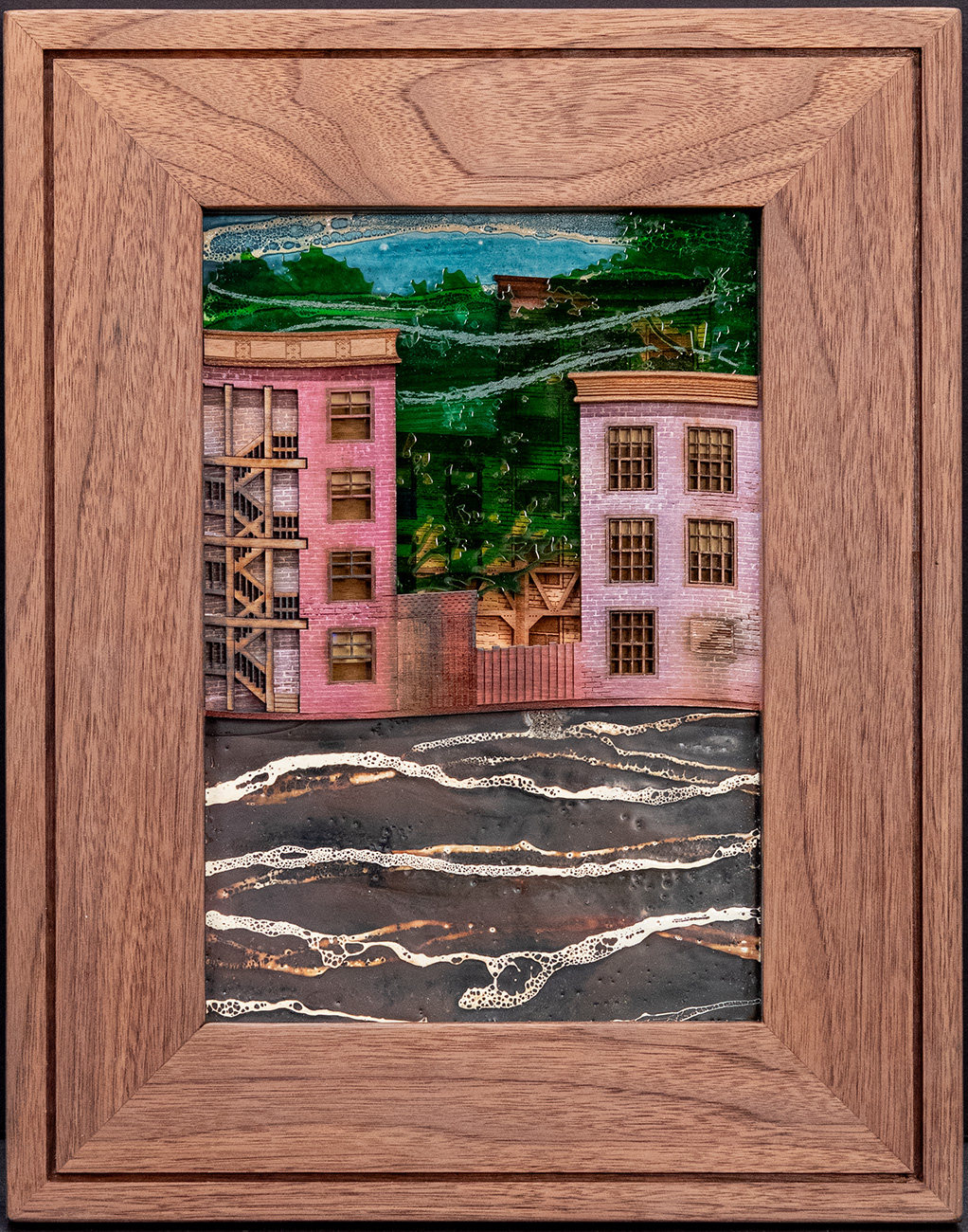 This is my first piece to incorporate encaustic wax! The buildings are wood, colored with watercolor paint and darkened in spots by burning it with my torch. The underground and sky is encuastic. It's framed with walnut.