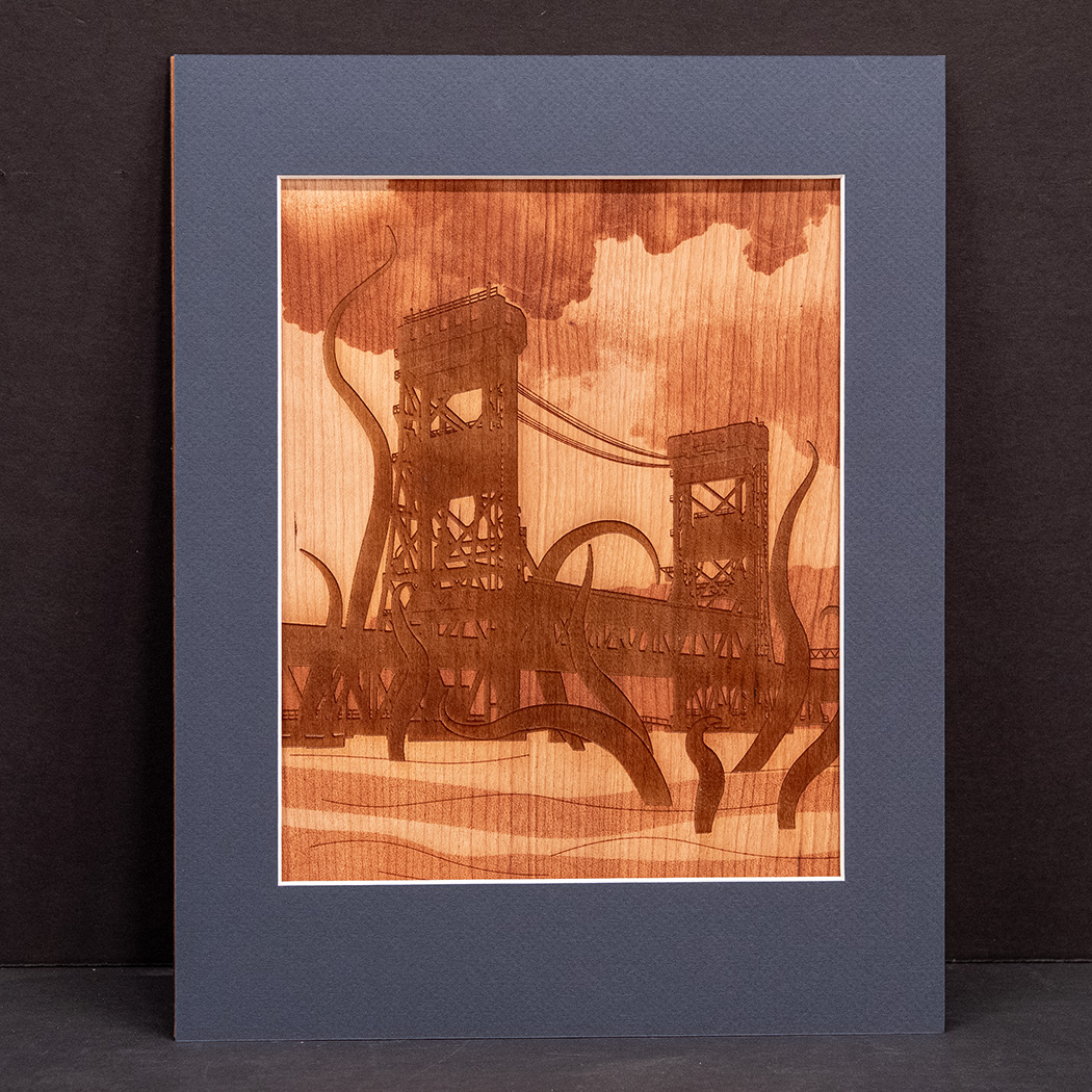 The artwork is burned into the wood with a laser and sealed with tung oil. The outer dimensions of the matting are 11" x 14" so it fits into commonly available frames.