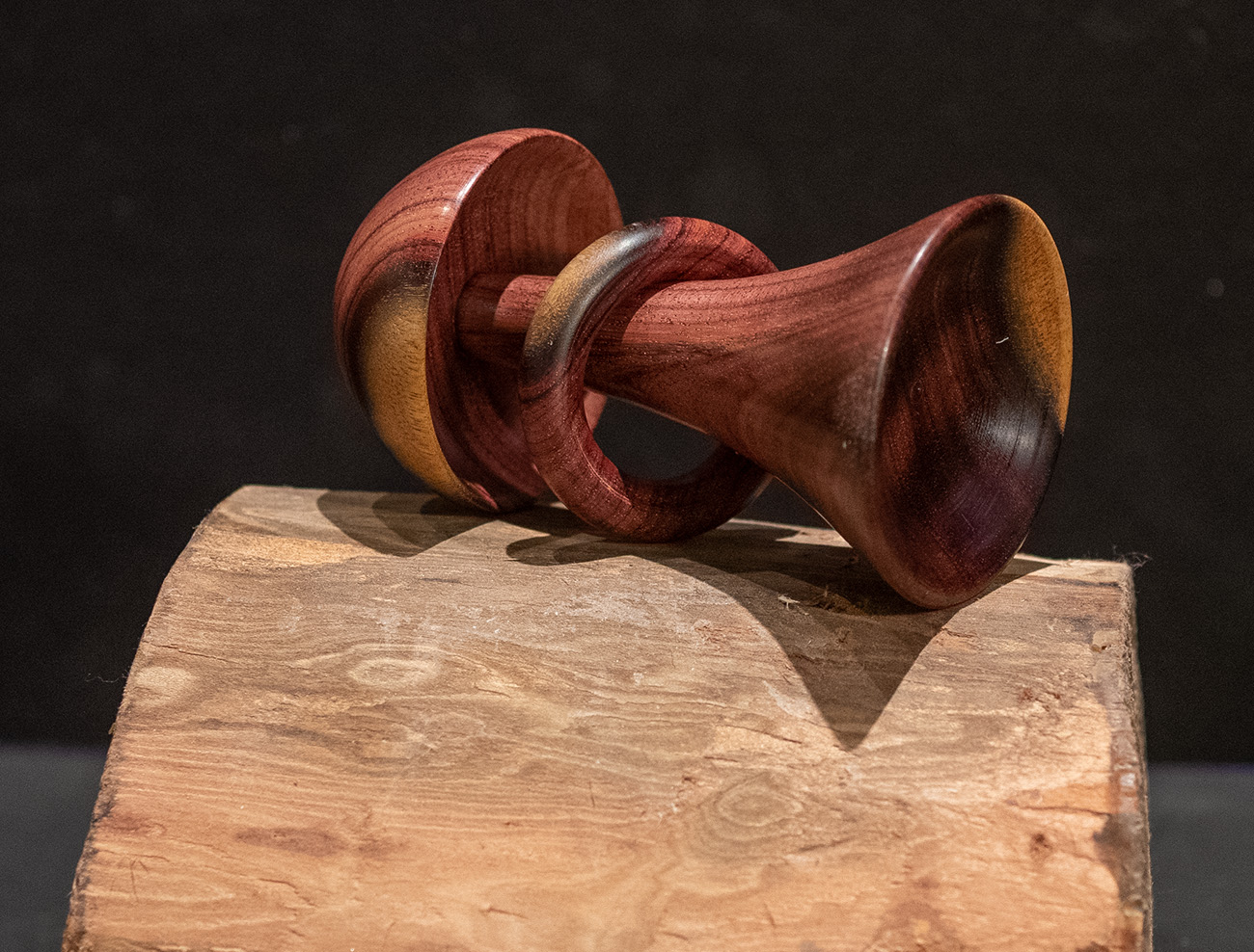 This is a baby toy which is fun to feel and manipulate. It's smaller than it looks in the photo and works well with tiny hands. It's made from katalox. This is a very dense wood but cuts cleanly, so it was fun to work. The light part of the wood is the sapwood, and the dark part is the heartwood. This piece of wood also had a very visible, almost black, boundary between the sapwood and the heartwood, which I love.