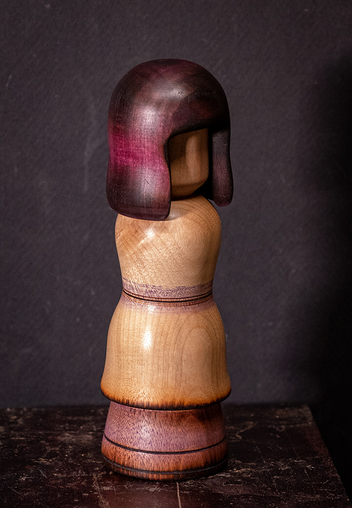 I really like how this figurine turned out. The myrtle wood used for the body scorched in a very interesting manner when I used my torch on it and working purple watercolor paint into the pores gave an interesting texture to the colored areas. The hair is maple, scorched with my torch and dyed purple with Transtint dyes.