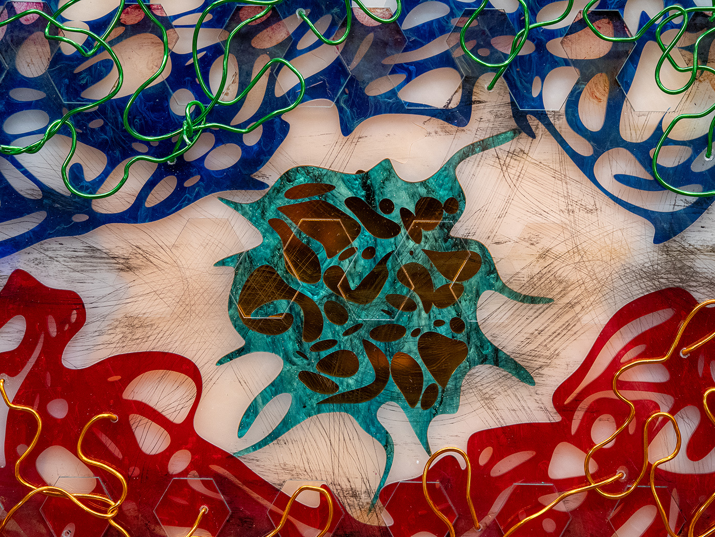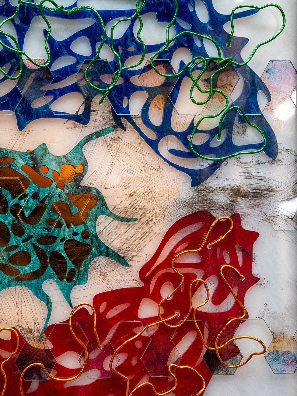 This piece is a new direction for me and I really got into it. It's very organic. So scribbly! I achieved some really fine lines by scratching the back of one of the acrylic sheets and working paint into the scratches (along with other paint not worked into the scratches). The center of the back layer is an amber mirror and there are colorful scribbles of anodized aluminum wire on top of everything. The frame is gorgeous walnut with streaks of the lighter sapwood along some of the edges.