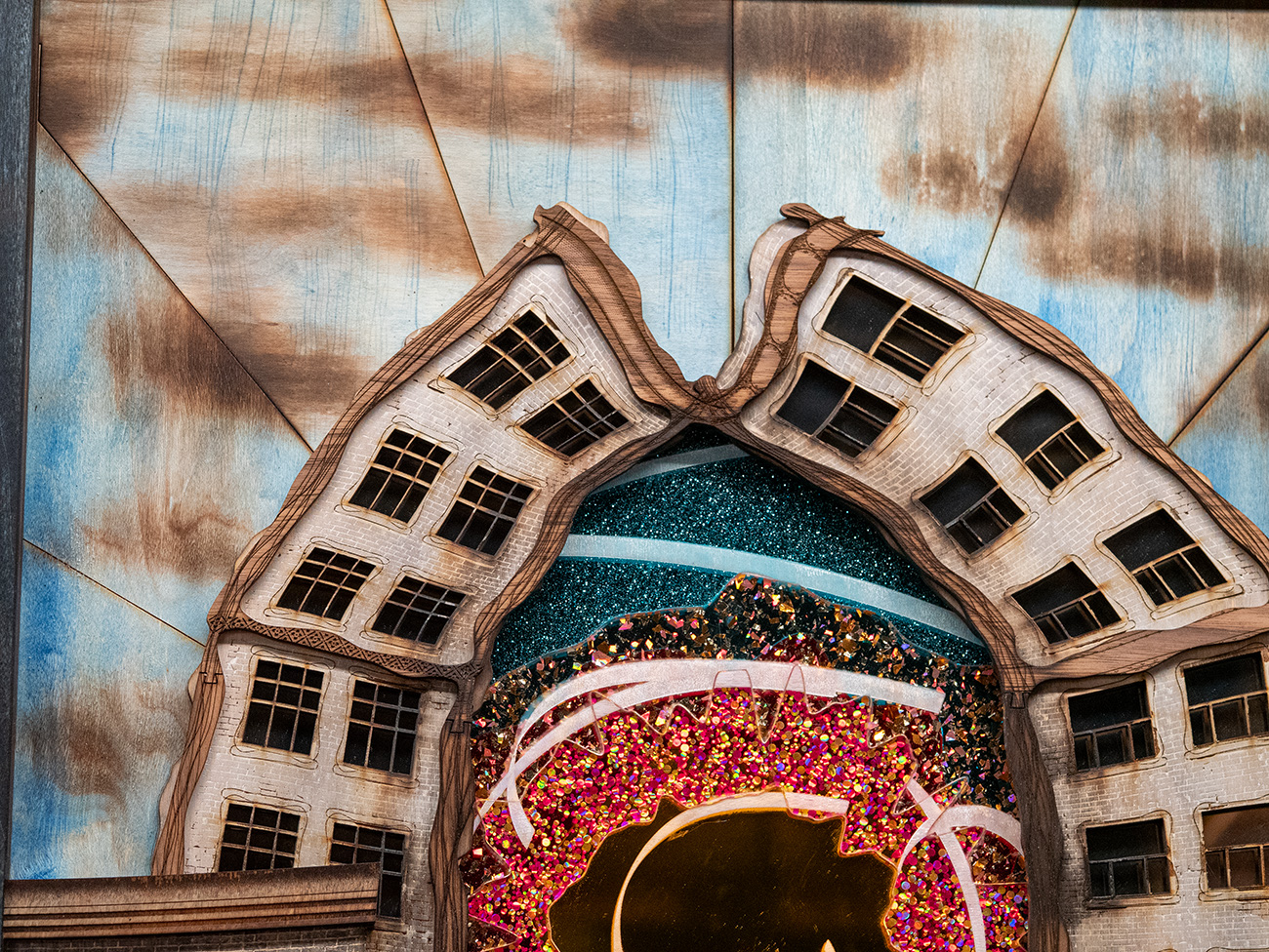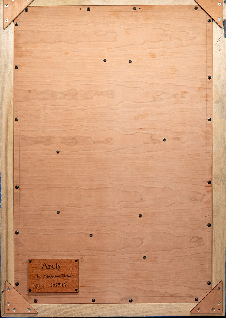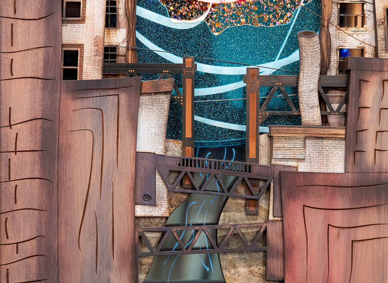 This piece is created from layers of wood, acrylic sheet, stone (slate), and mirror. The wood layers are colored with watercolors and burned with my propane torch. The frame is poplar wood, dyed with aniline dyes and india ink, sealed with tung oil.